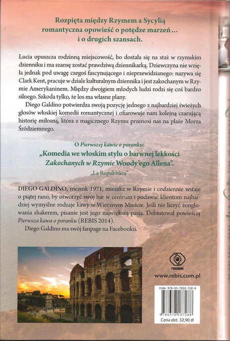 Lucia opuszcza rodzinną miejscowość, bo dostała się na staż w rzymskim dzienniku i ma szansę zostać prawdziwą dziennikarką. Dziewczyna nie wzięła jednak pod uwagę czegoś fascynującego i nieprzewidzianego: nazywa się Clark Kent, pracuje w dziale kulturalnym dziennika i jest zakochanym w Rzymie Amerykaninem. Między dwojgiem młodych ludzi rodzi się coś bardzo silnego. Szkoda tylko, że los ma własne plany. Po Pierwszej kawie o poranku Diego Galdino potwierdza swoją pozycję jednego z najbardziej świeżych głosów włoskiej komedii romantycznej i ofiarowuje nam kolejną czarującą historię miłosną, która z magicznego Rzymu przenosi nas na plaże Morza Śródziemnego.