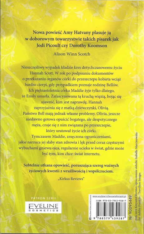 Nieszczęśliwy wypadek kładzie kres dotychczasowemu życiu Hannah Scott. W rok po podpisaniu dokumentów o przekazaniu organów córki do przeszczepu kobieta wciąż bardzo cierpi. Wtedy poznaje rodzinę Bellów. Ich piętnastoletnia córka Maddie żyje tylko dlatego, że Emily umarła. Zafascynowana tą kruchą więzią, bojąc się ujawnić, kim jest naprawdę, Hannah nawiązuje niespodziewaną przyjaźń z matką dziewczynki, Olivią. Państwo Bell mają jednak własne problemy. Olivia, jeszcze niedawno gotowa opuścić bogatego, ale despotycznego męża, czuje się z nim związana po przeszczepie, który uratował życie ich córki. Tymczasem Maddie, zmęczona ograniczeniami, jakie narzuca jej słaby stan zdrowia i lęk przed coraz częstszymi wybuchami gniewu ojca, regularnie ucieka w świat, gdzie może być tym, kim chce: świat internetu. Mistrzowsko poprowadzona narracja i sugestywnie zarysowane postaci bohaterów, którzy muszą stawić czoło prawdzie, to główne atuty tej trzymającej w napięciu lektury.